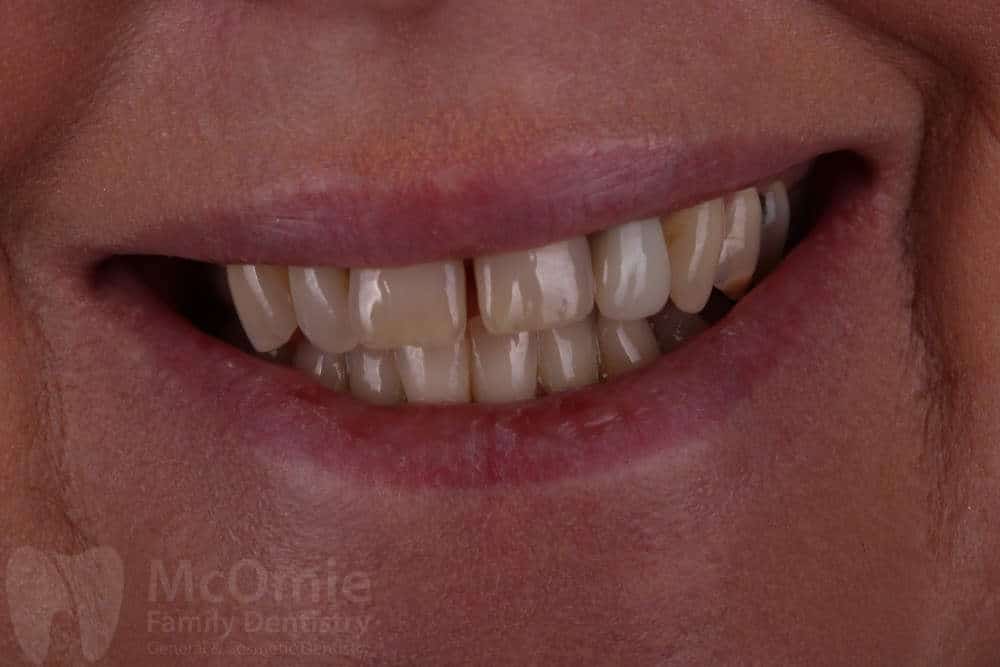 Before this patient’s teeth had old discolored restorations there was little symmetry. The teeth were misaligned and had a dark color. Dr. McOmie placed these beautiful ceramic biocompatible crown restorations and veneers.