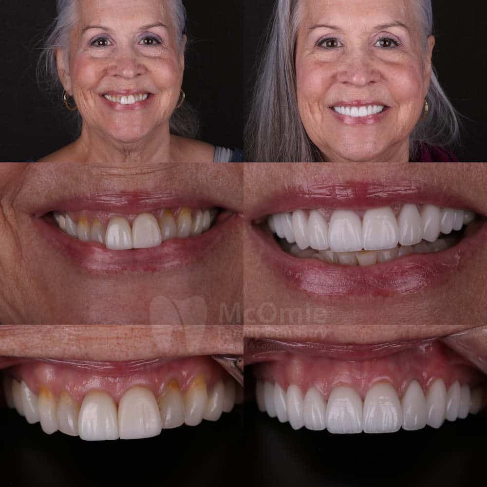 This patient was dealing with discolored old metal crowns, which created darkness at the gumline. Dr. Mcomie and our team used a combination of modern porcelain crowns and veneers to give her a new natural-looking smile she deserves.
