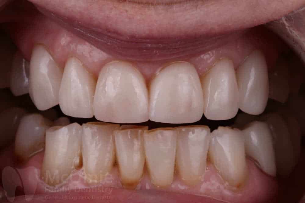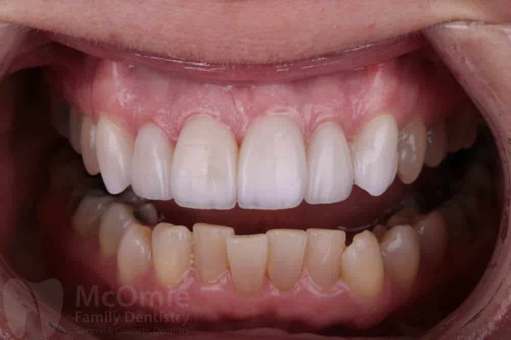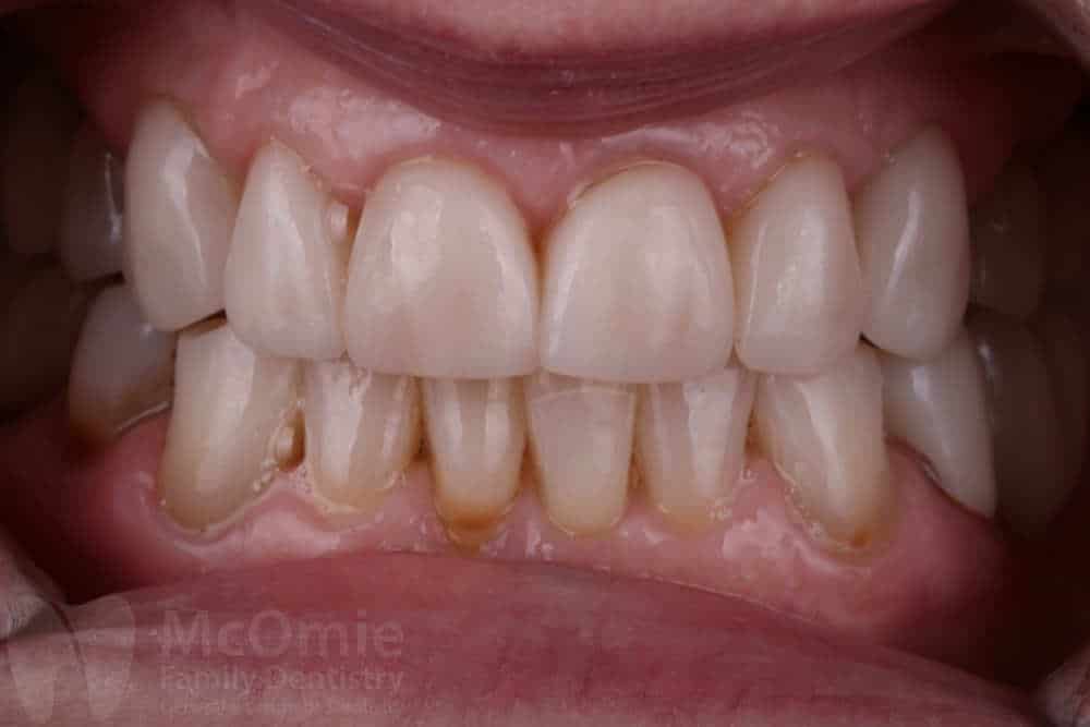 This patient’s teeth were affected by deep staining from tetracycline, an antibiotic once prescribed during childhood, which left dark, internal discoloration that couldn’t be lightened with whitening. To address this, Dr. McOmie placed ceramic veneers on the front teeth, effectively concealing the stains and creating a brighter, naturally beautiful smile. The new veneers not only enhance the appearance but also provide long-lasting coverage for the underlying discoloration.