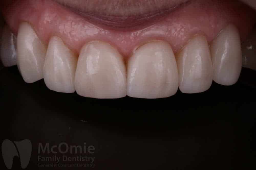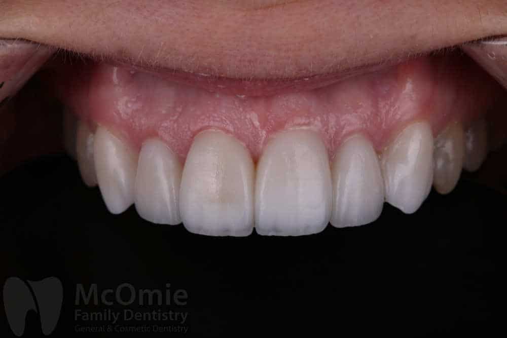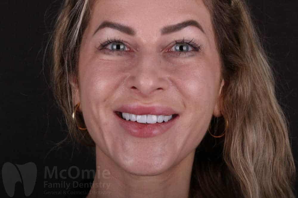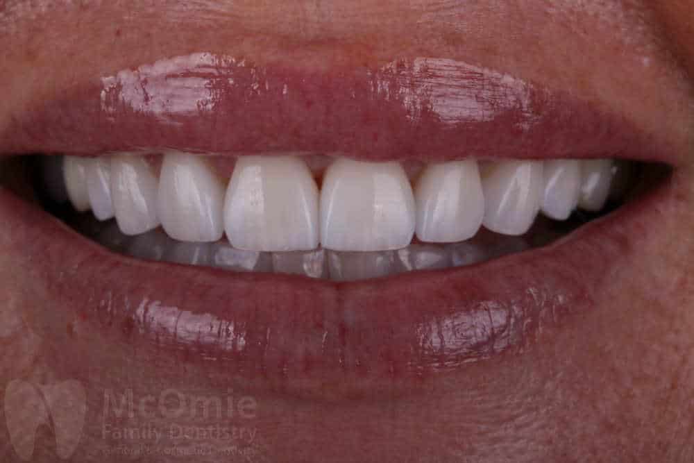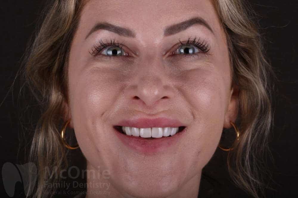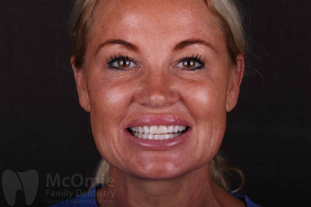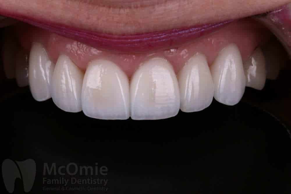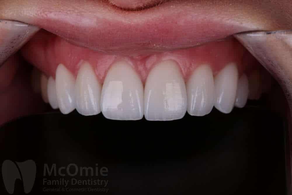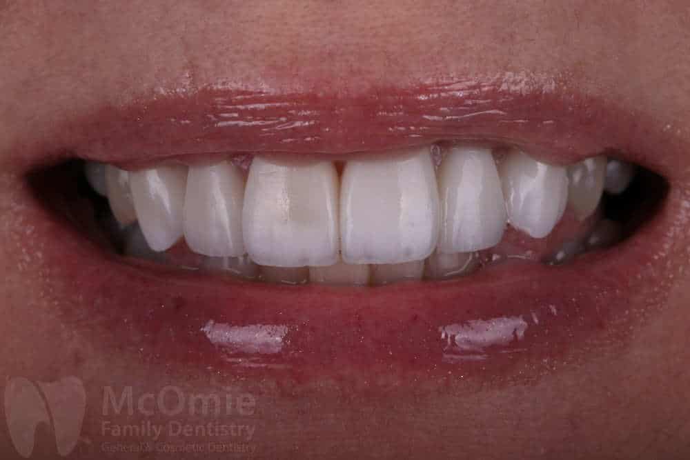 Before this patients’ teeth were of different shapes and sizes. Dr. McOmie and our team were able to give her a new, even, and symmetrical smile.