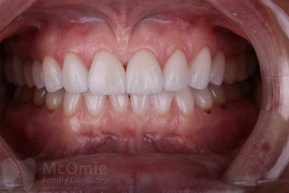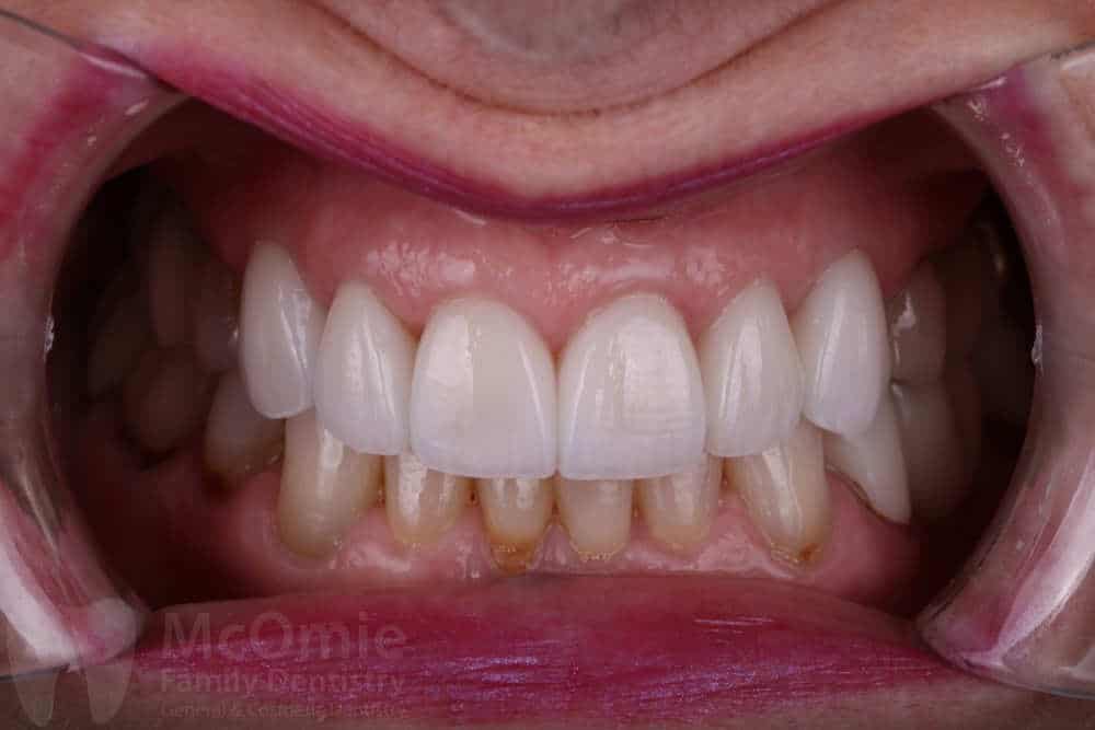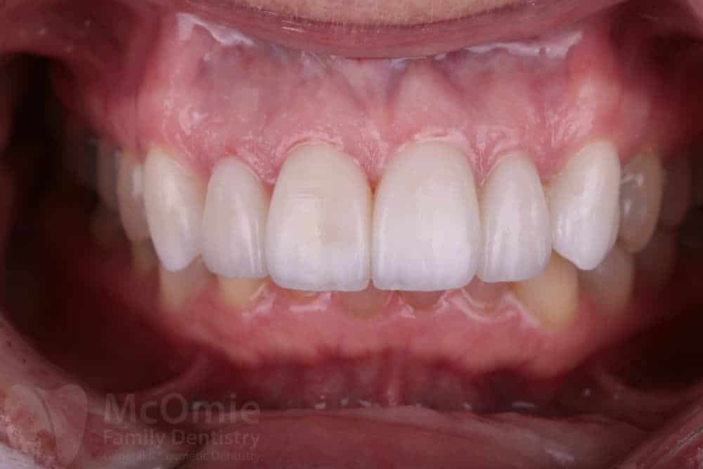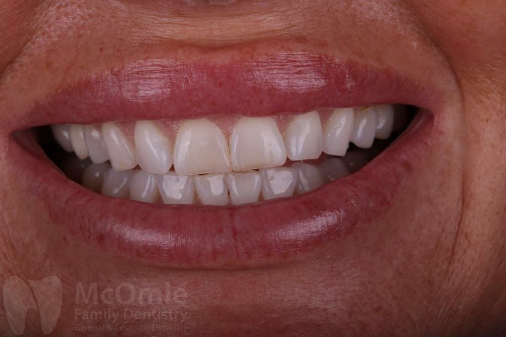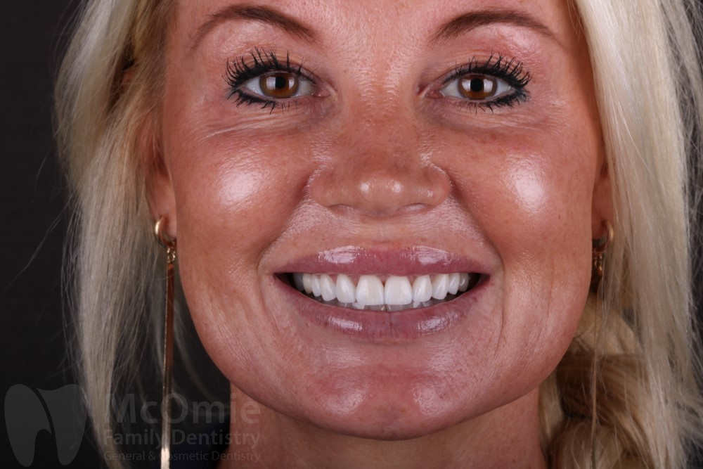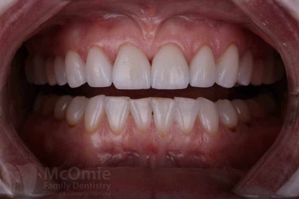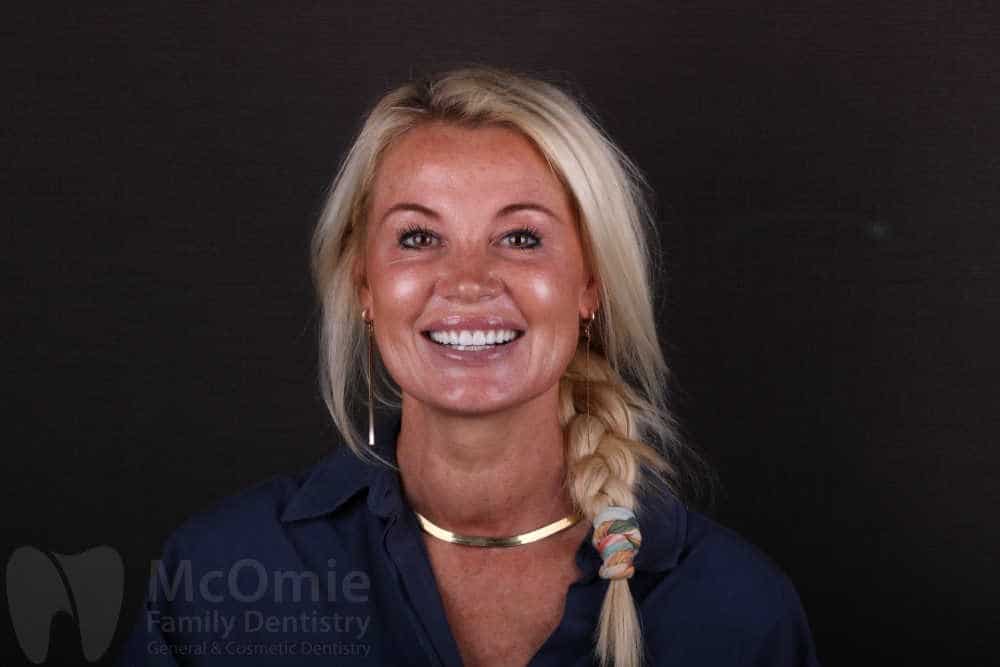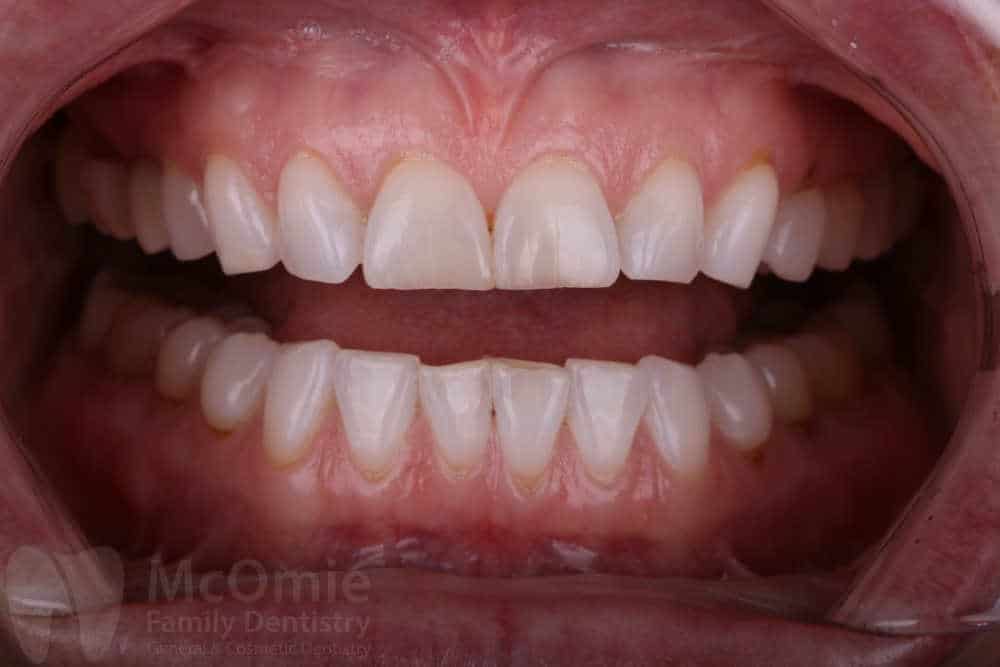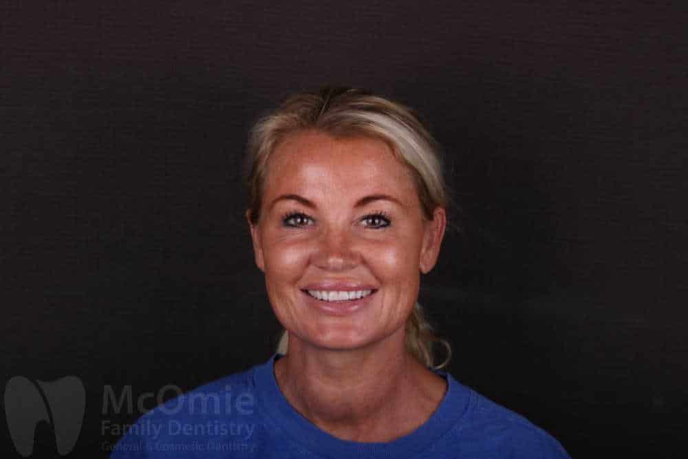 Before this patients’ teeth were of different shapes and sizes. Dr. McOmie and our team were able to give her a new, even, and symmetrical smile.