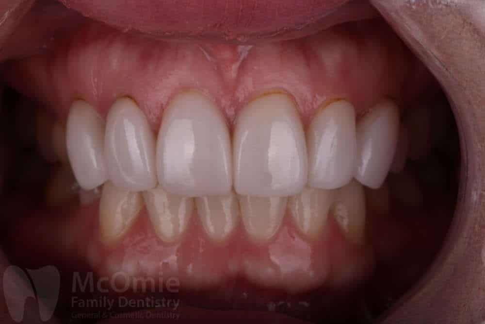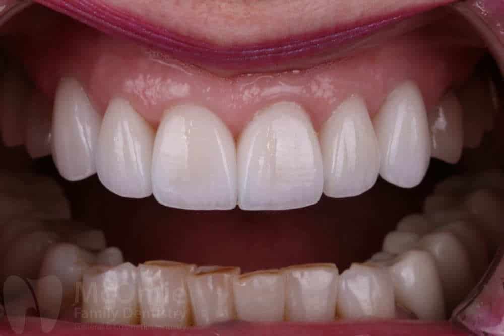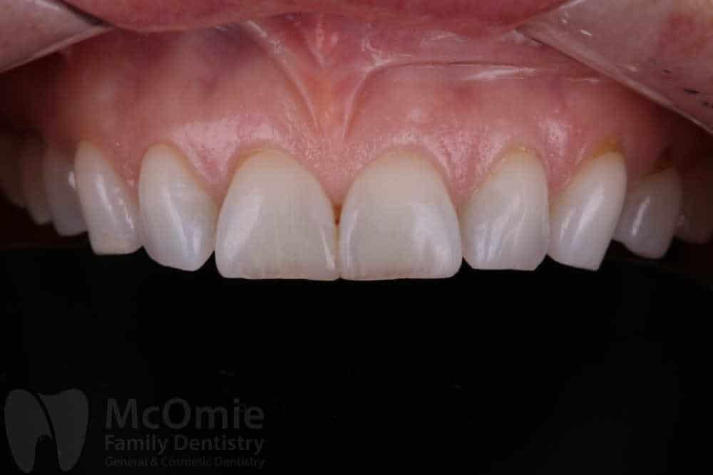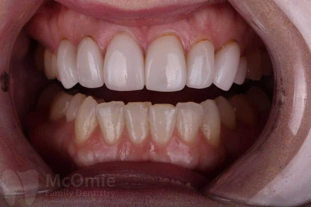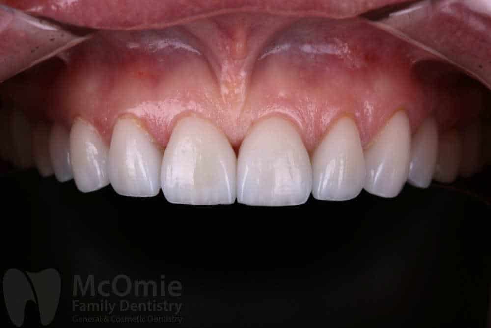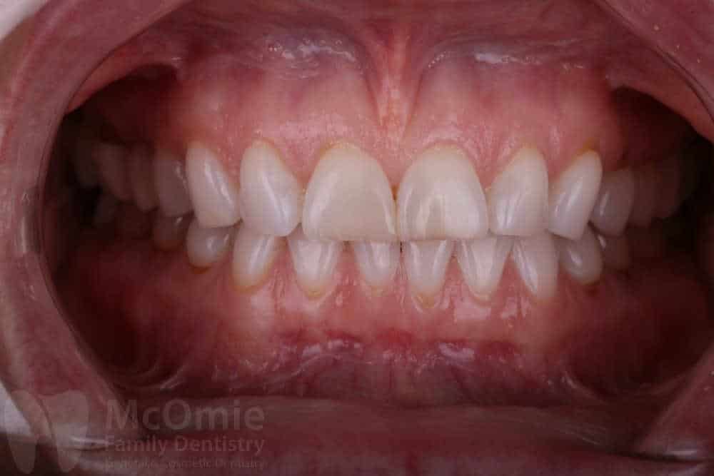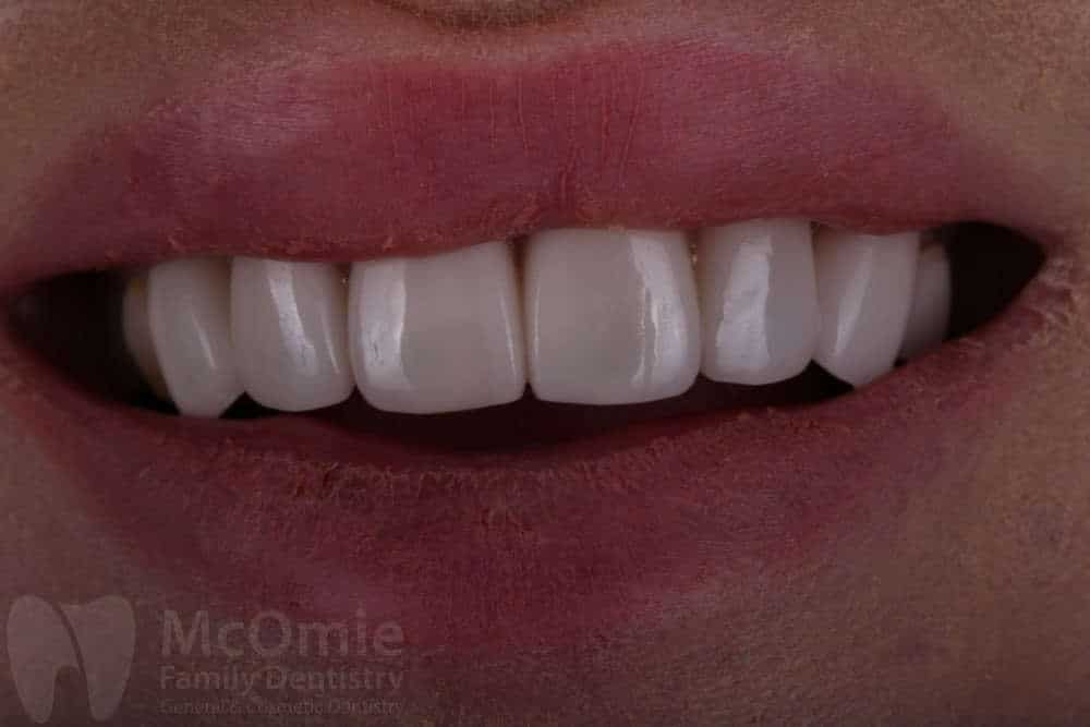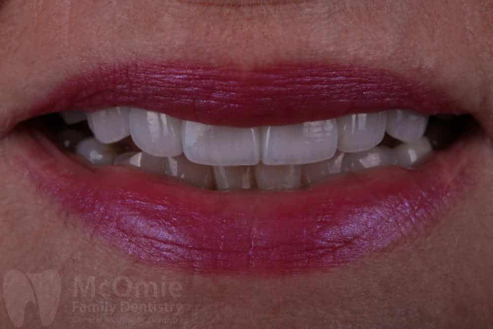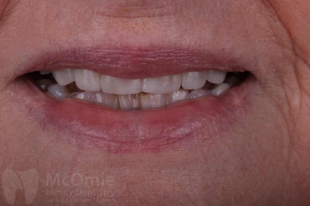 Before this patients’ teeth were of different shapes and sizes. Dr. McOmie and our team were able to give her a new, even, and symmetrical smile.
