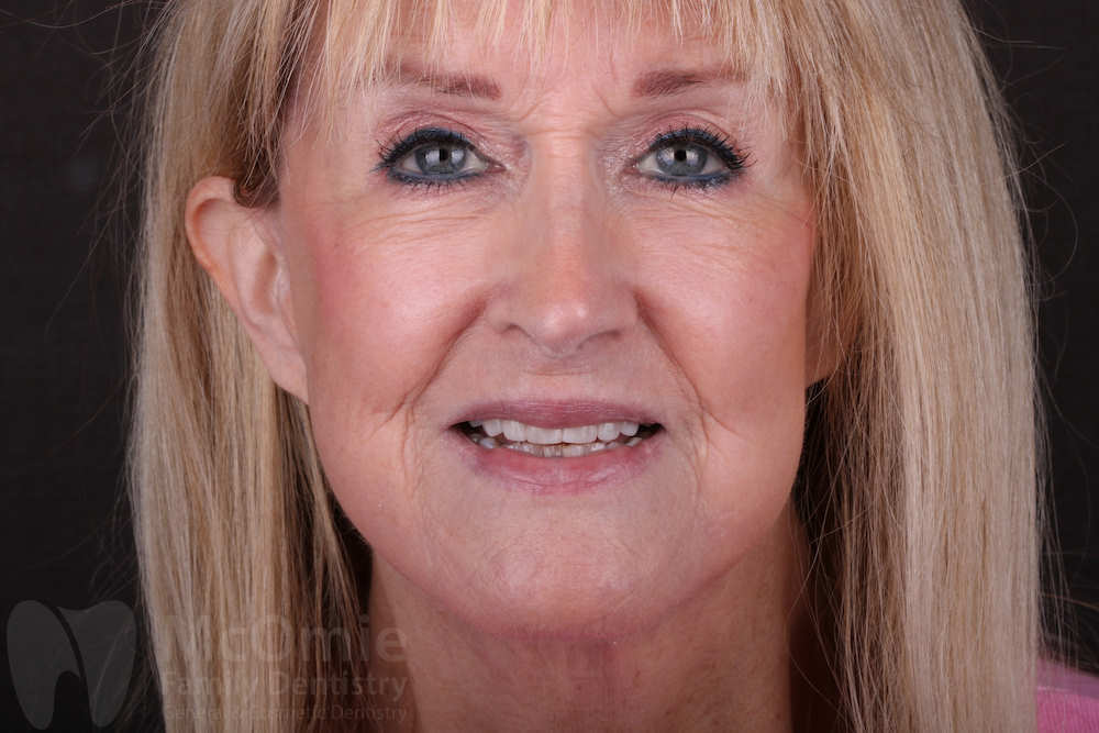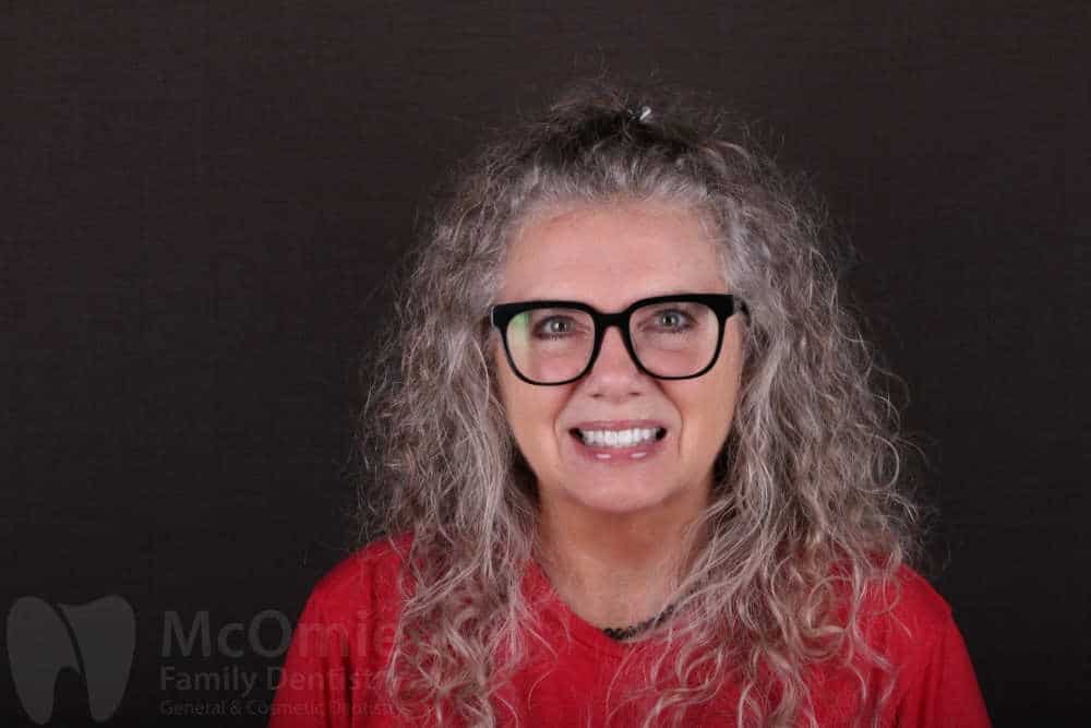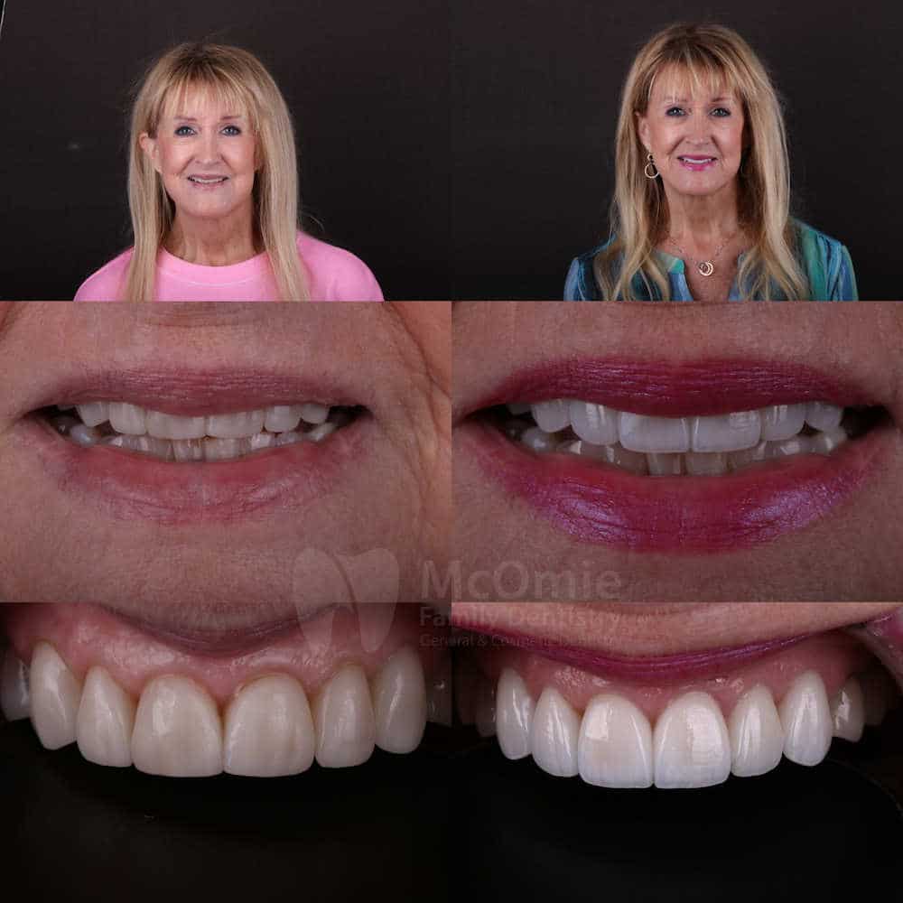 Two veneers were done years ago, and then she decided to re-do them to a lighter color and let Dr. McOmie do two more to make the teeth proper size and fit into her smile to make it dazzling.