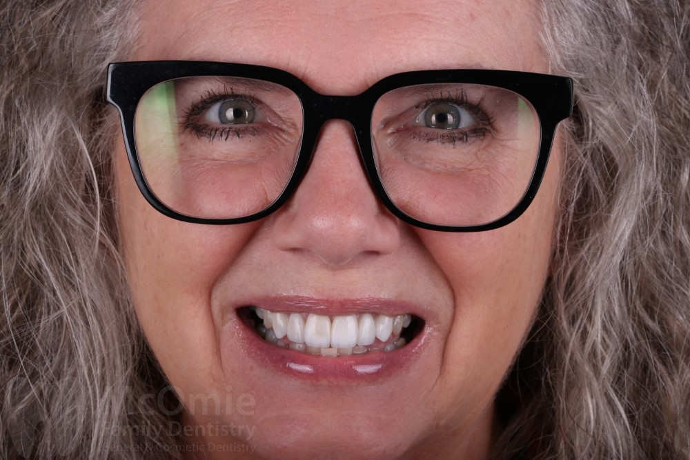 This case highlights the power of cosmetic dentistry to improve a person’s life. After having old, discolored, worn-down veneers for nearly three decades, this patient came to Dr. Mark McOmie seeking an upgrade. Dr. McOmie placed biocompatible porcelain veneers and, with the help of our master ceramists, was able to create a set of teeth that looks completely natural and vibrant. The patient is overjoyed with her new smile – it’s so healthy-looking and full of detail, and it has made a massive difference in her life. She feels more confident than ever before.