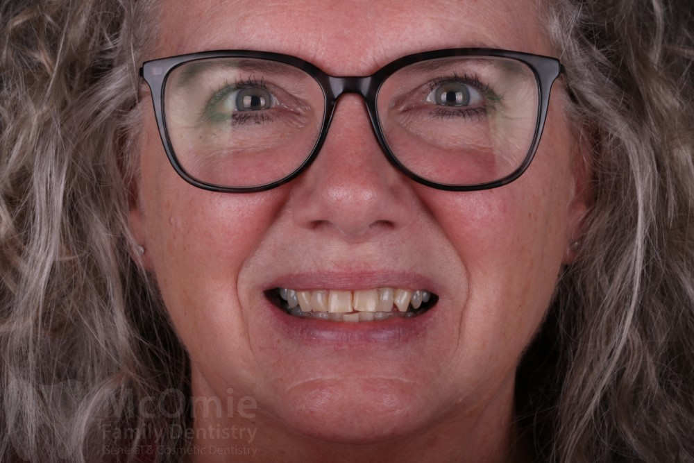 A childhood accident left this patient with broken front teeth, which had been repaired over the years with dental bonding. While the bonding improved their appearance, she wanted a more beautiful and natural-looking smile—one that truly reflected how her teeth looked before the accident. To achieve this, Dr. Mark McOmie placed one crown and five custom veneers, carefully designed to restore the original shape, color, and proportions. The final result is a seamless, lifelike smile that brings back both function and confidence.