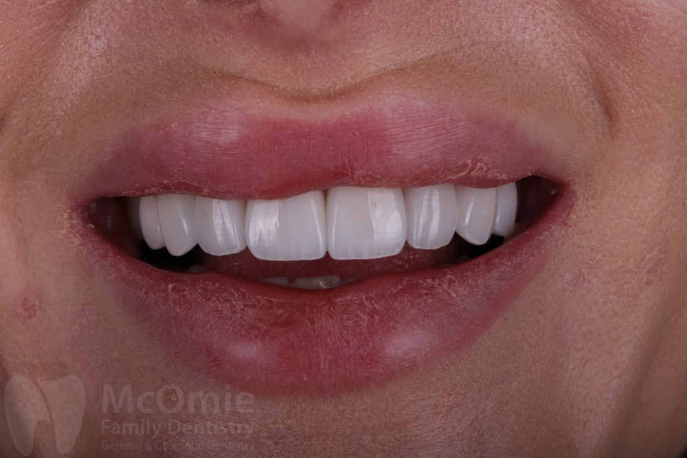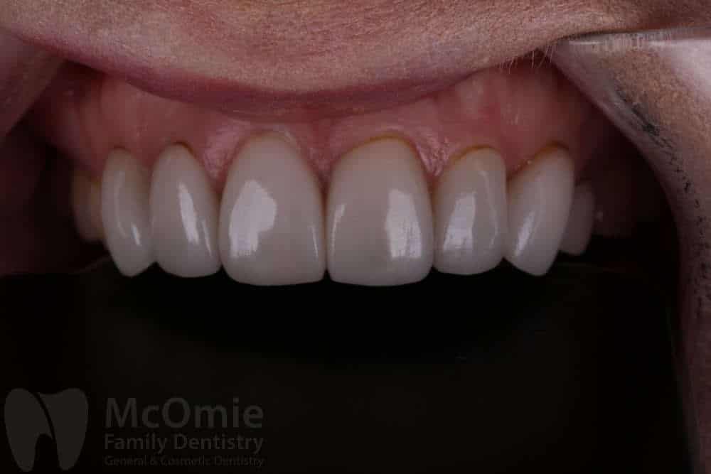Before treatment, this patient’s teeth were uneven and visibly worn. After Dr. McOmie and our expert ceramists applied six dazzling veneers, the transformation was stunning. The teeth now radiate with a healthy, gleaming appearance. These enhancements have given the patient a brilliantly renewed smile.
