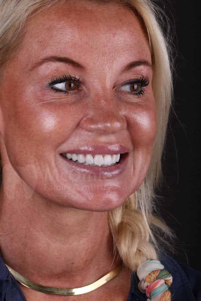 After suffering from short and stained teeth for quite some time, we were able to help her smile by placing six new beautiful bio-compatible veneers that are metal-free—giving her a new full smile.
