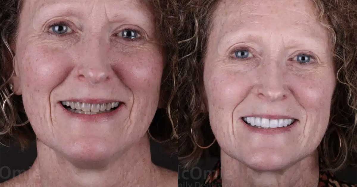 In this case, Dr. Mark McOmie used custom zirconia ceramic veneers to mask the discoloration and create a brighter, natural-looking smile. If whitening has not helped banded or gray stains, a quick consult can confirm whether veneers or crowns are the better option for your teeth and bite.