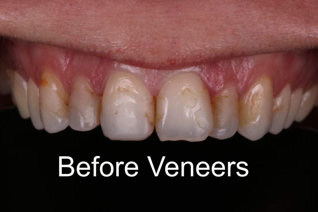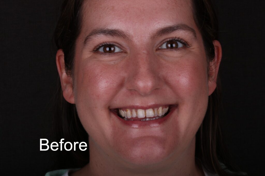 Before. Staining, chips, and uneven edges on the front teeth.
